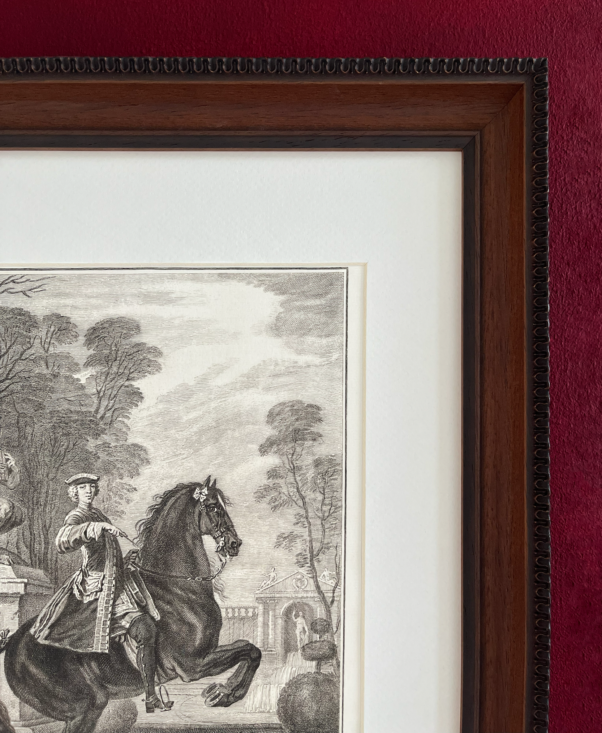 This engraving, attributed to the talented Charles Parrocel, features a rider whose identity is not definitively known. The coat of arms belongs to the Walramic branch of the House of Nassau, a noble family of German origin with reigning princes dating back to the 12th century. The figure may represent Charles, Prince of Nassau-Usingen (1712–1775), a known patron of the arts and publishing, who founded a printery in Wiesbaden: possibly linked to the printing of de La Guérinière’s work. Though he may have been too young to model for this plate, other likely candidates include Karl-August (1685–1753) or Karl-Ludwig (d. 1723), whose Germanic names align with "Charles."